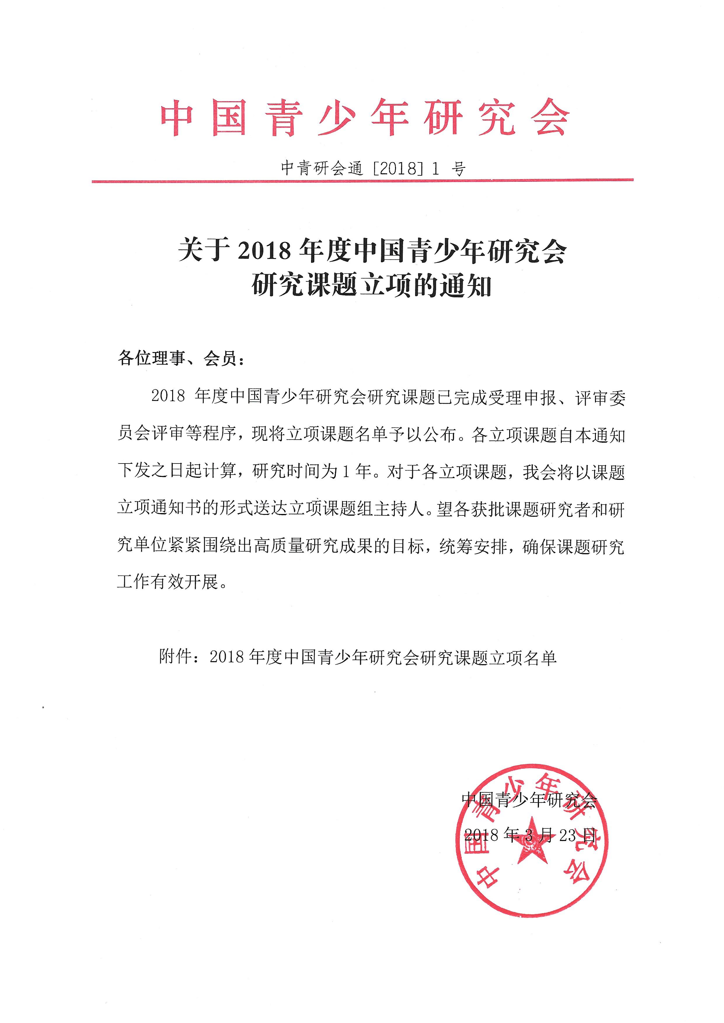 关于2018年度中国青少年研究会研究课题立项的通知及名单